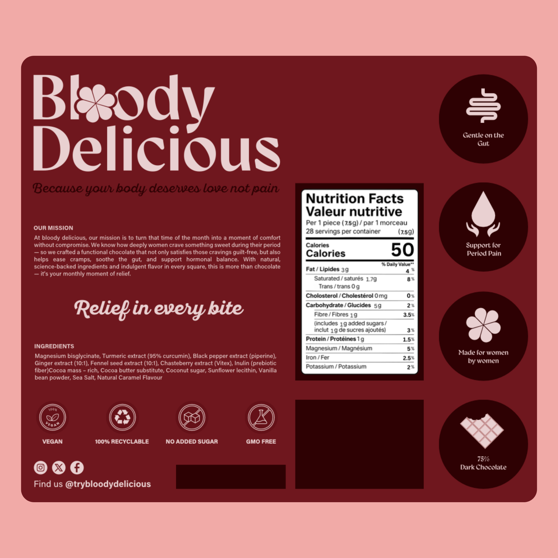 Bloody Delicious 75% dark chocolate bar with cycle-supporting botanicals