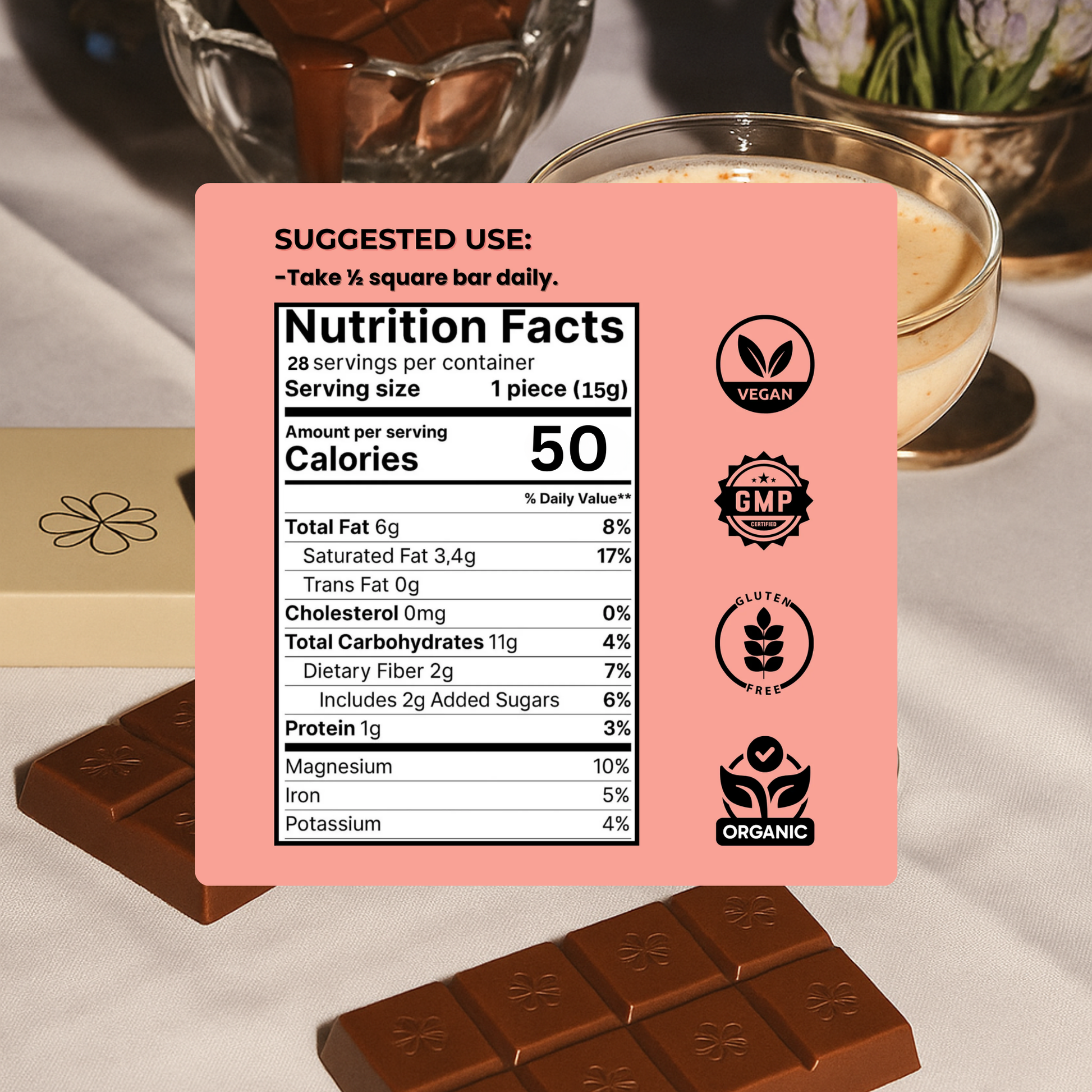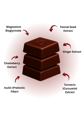 75% dark chocolate with magnesium bisglycinate, ginger extract, turmeric (curcumin), chasteberry (vitex), fennel seed, and prebiotic fibers (cacao & inulin). Vegan, non-GMO, no artificial sweeteners or dyes.